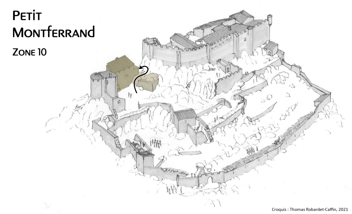 Depuis la cour, on accède au niveau 3 par un escalier en partie taillé dans le rocher. Celui-ci mène à la terrasse haute (zone 12) qui dessert le vestibule d'entrée, dont le seuil est encore visible. Cette petite pièce de 2,7 m par 1,90 m correspond à une construction appuyée en appentis contre le Petit Montferrand.