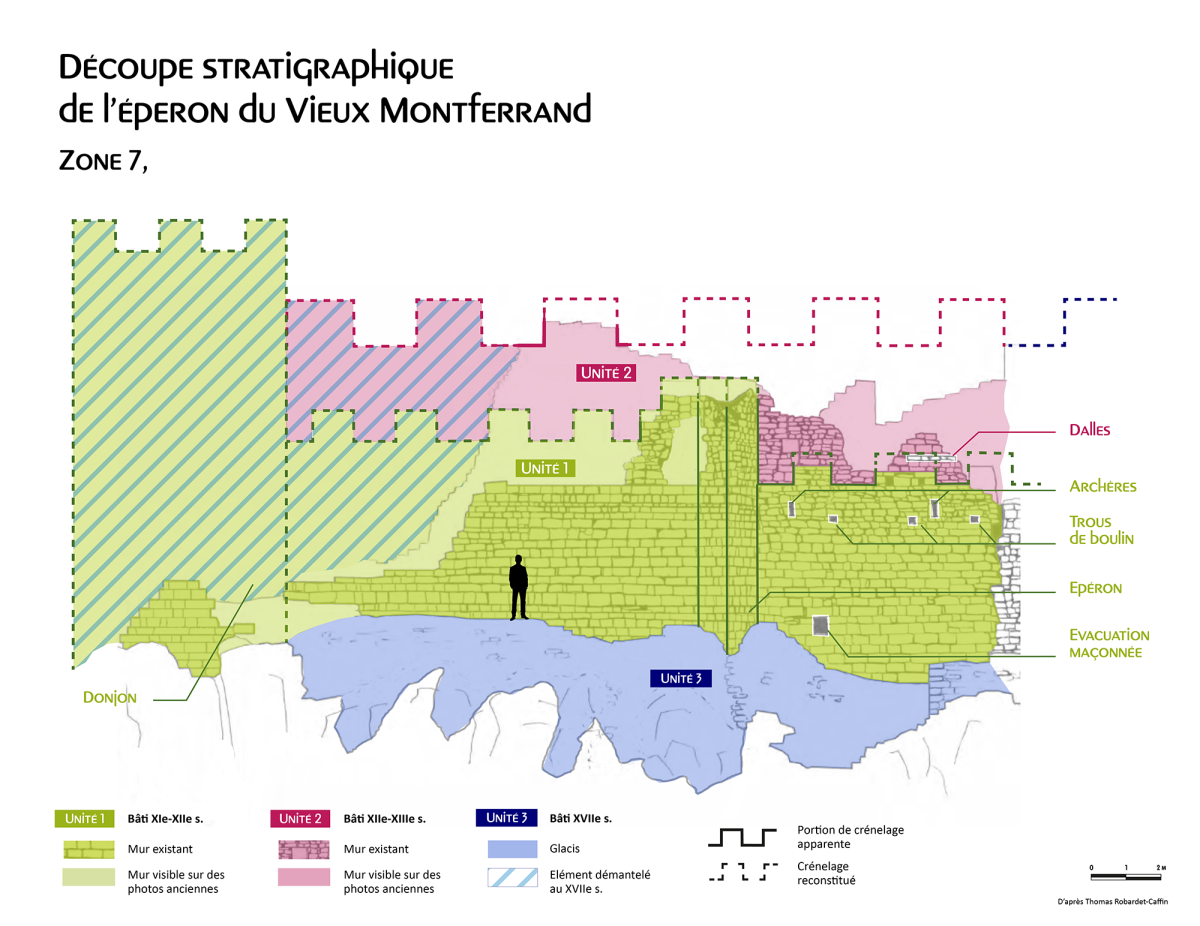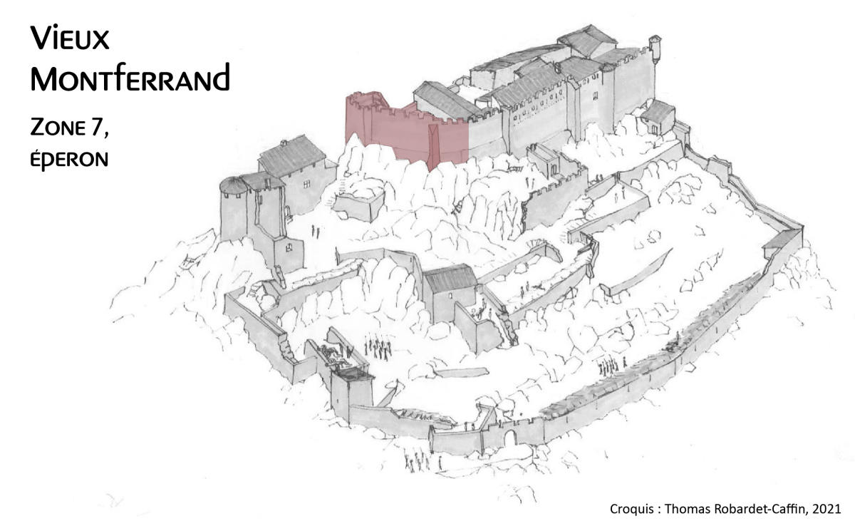 La partie haute du Vieux Montferrand abrite la fortification en pierre la plus ancienne du site. Celle-ci est visible à la base des faces sud et ouest de la zone 7 (unité 1). Toutes les portions de ce mur sont synchrones : les maçonneries, identiques, sont structurellement liées. Seule leur fonction dans le mur diffère.
