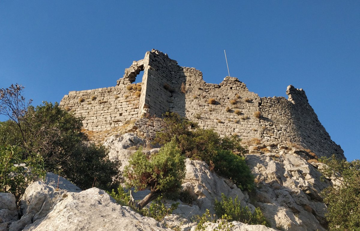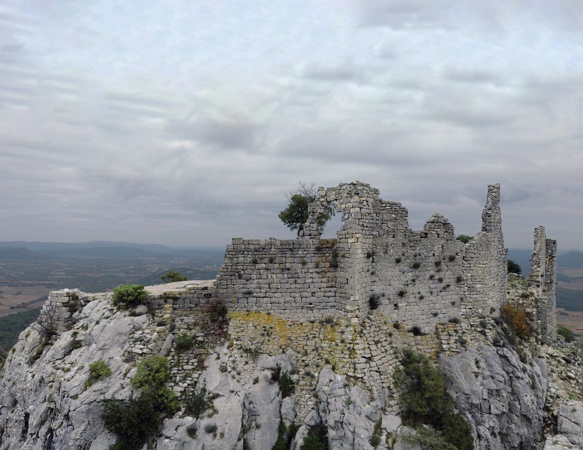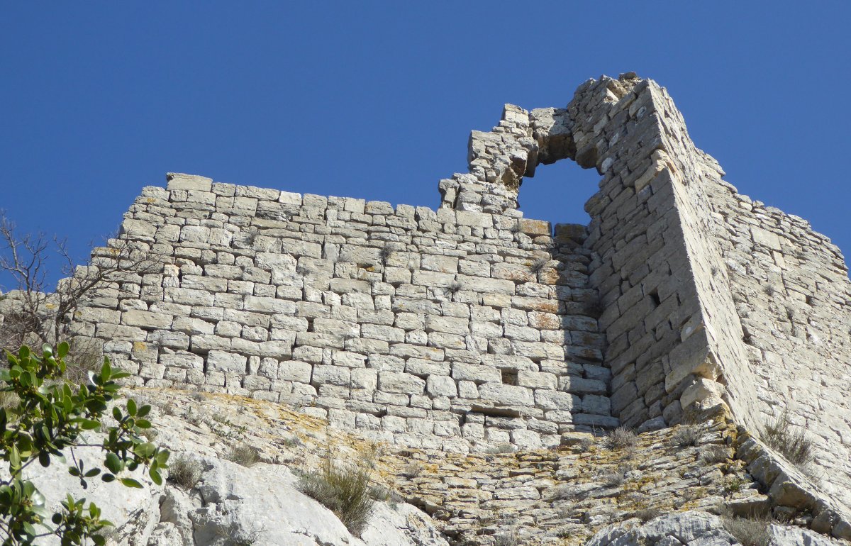 Au sommet de l’unité 1, à droite de l’éperon, deux merlons sont reconnaissables aux "coups de sabre" apparents dans la maçonnerie : ils ont été intégrés dans les surélévations successives. L’ensemble est plus irrégulier (unité 2) car les bâtisseurs ont utilisé des moellons « ébauchés » (taillés grossièrement).
