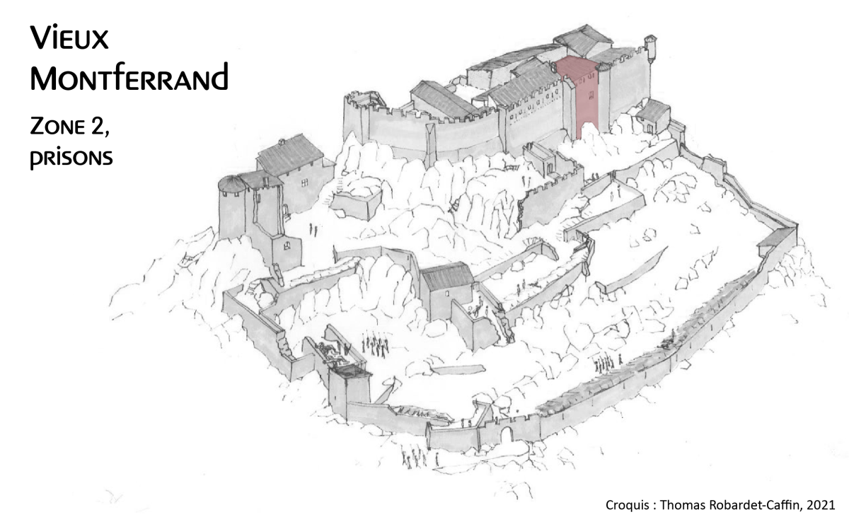 Les prisons du château sont constituées de trois cellules contiguës aménagées dans les caves du bâtiment 2 du Vieux Montferrand, sous la grande salle qui sert de cour de justice (aula). Elles sont bordées à l’ouest par la cave du réfectoire, transformée au XVIIe siècle en citerne (zone 1) et la cave du tinal à l’est (zone 3).