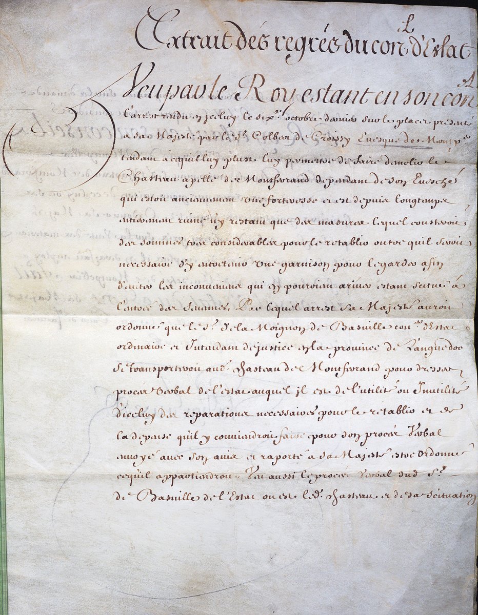 "Veu par le Roy estant en son conseil l’Arrest rendu en iceluy, le sixième octobre dernier, sur le placet présenté à Sa Majesté par le sieur Colbert de Croissy, evesque de Montpellier, tendant à ce qu’il luy plust luy permettre de faire démolir le chasteau appelé de Montferrand dépendant de son Evesché, qui estoit anciennement une forteresse et est depuis longtemps entièrement ruiné, n’y estant que des masures, lequel cousterait des sommes très considérables pour le rétablir, outre qu’il seroit necessaire d’y entretenir une garnison pour le garder afin d’éviter les inconvénients qui en pourroient arriver, estant scitué à l’entrée des Sévennes. Par lequel arrest Sa Majesté auroit ordonné que le sieur de La Moignon de Basville, conseiller d’Estat ordinaire et Intendant de justice en la province de Languedoc, se transporteroit au dit Chasteau de Montferrand pour dresser procès verbal de l’estat auquel il est de l’utilité ou inutilité d’iceluy, des réparations necessaires pour le rétablir et de la dépense qu’il y conviendroit faire, pour son procès verbal envoyé avec son avis et raporté à Sa Majesté estre ordonné ce qu’il appartiendroit.